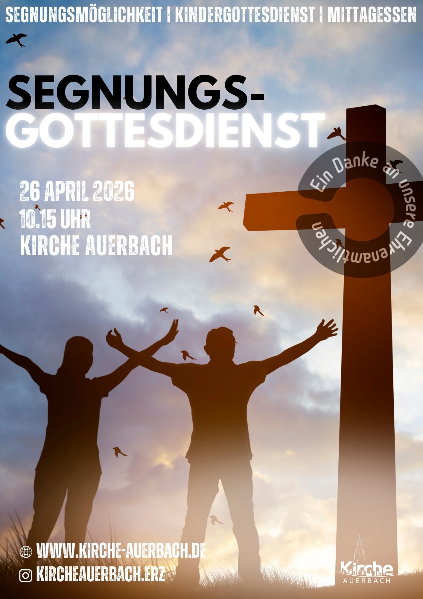 So 26.04. Danke-Gottesdienst mit Segnungsmöglichkeit, Kindergottesdienst und gemeinsamen Mittagessen 10:15 - 11:45 Uhr Kirche Auerbach |